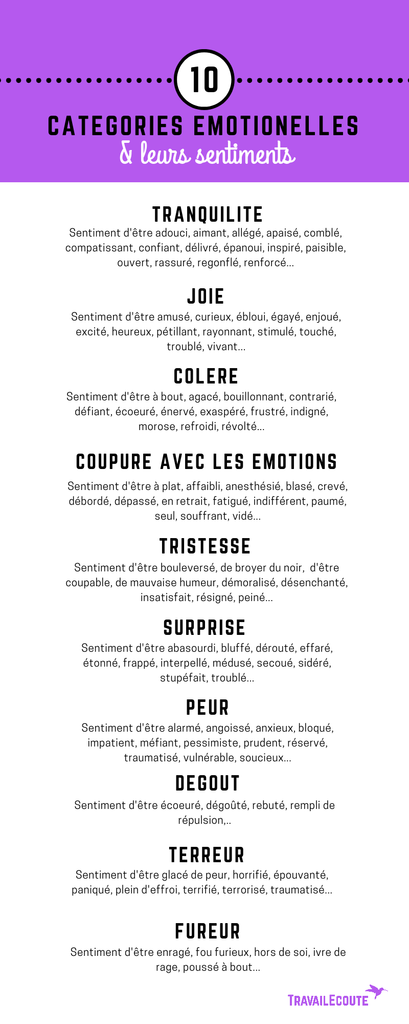 Exprimer ses sentiments n’est pas chose facile, encore moins aisé quand il s’agit de décrire ses émotions à un supérieur ou tout simplement à quelqu’un de son entourage. La première difficulté est de trouver les mots pour décrire ce que l’on ressent. On peut alors se servir d’une liste des sentiments (voir l’image ci-dessous) établie par Jean Philippe Faure qui recense 879 sentiments répartis en dix catégories d’émotions : tranquillité, joie, colère, tristesse, surprise, peur, dégoût, terreur, fureur, coupure avec ses émotions. Par exemple, la personne peut se sentir triste (émotion) et avoir le sentiment d’être découragé (sentiment). Le tout est de ne jamais utiliser les pronoms « tu » ou « vous » mais n’utiliser que le « je » dans l’expression des sentiments.
