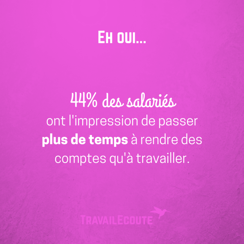Peut-on être heureux au travail lorsque l’on passe plus de temps à rendre des comptes qu’à réellement créer de la valeur ajoutée ? A ce jour, deux personnes sur cinq, ayant répondu à l’enquête estiment être dans ce cas-là (source : Enquête Parlons Travail – CFDT). D’ailleurs, les hommes semblent être plus nombreux à déclarer « parfois, j’ai l’impression que je passe plus de temps à rendre des comptes qu’à travailler » que les femmes (46% contre 42% pour ces dernières). Et vous ? Partagez-vous ce sentiment ? Acceptez-vous facilement de devoir justifier votre travail ? Venez donner votre avis et partager votre opinion, librement et anonymement, ici.