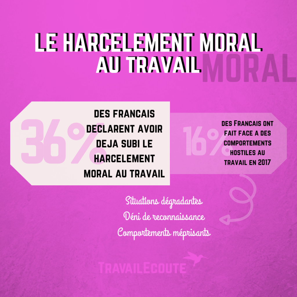 36% des français, à ce jour, déclarent avoir déjà subi le harcèlement moral au travail (source : Parlons Travail – CFDT). Et, en 2017, sans pour autant se sentir harcelés, 16% des français confient avoir fait face à des comportements « hostiles », et ce, de manière systématique (source : Enquête SUMER 2017).