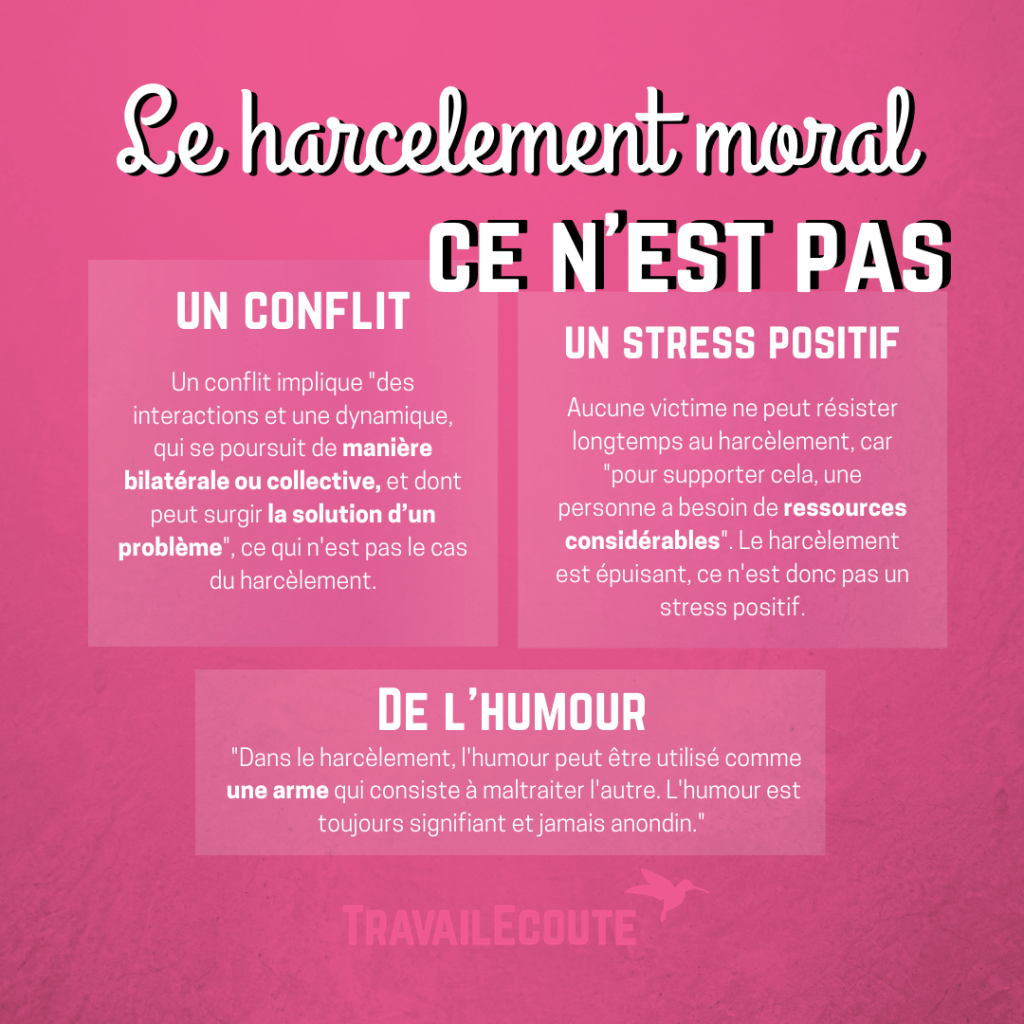 Au travail, pour différencier les problèmes relationnels générant des conflits d’un réel harcèlement, il est important de garder à l’esprit que le harcèlement est une suite d’agressions unilatérales. Alors qu’un conflit (qui peut être positif) implique lui, « des interactions et une dynamique qui se poursuit de manière bilatérale ou collective, et dont peut surgir la solution d’un problème » comme le relève très justement Marie Deveaud-Plédran dans sa thèse au sujet du harcèlement dans les relations de travail. Il serait préférable d’utiliser des méthodes de CNV plutôt que le harcèlement…
