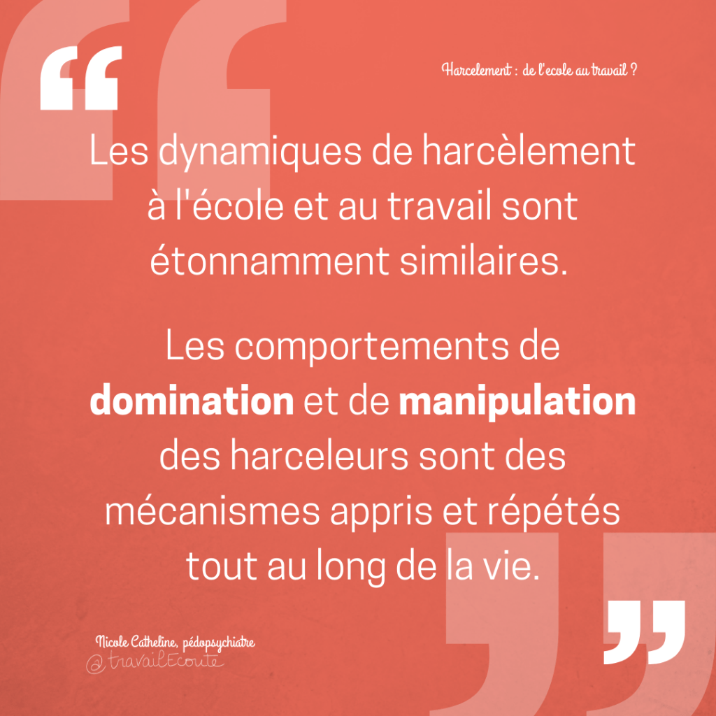 En effet, les comportements de domination, de manipulation et de violence psychologique observés chez les enfants harceleurs peuvent se retrouver chez les adultes dans des contextes professionnels. Selon Nicole Catheline, pédopsychiatre et auteure, « les dynamiques de harcèlement à l’école et au travail sont étonnamment similaires. Les comportements de domination et de manipulation des harceleurs sont des mécanismes appris et répétés tout au long de la vie ».