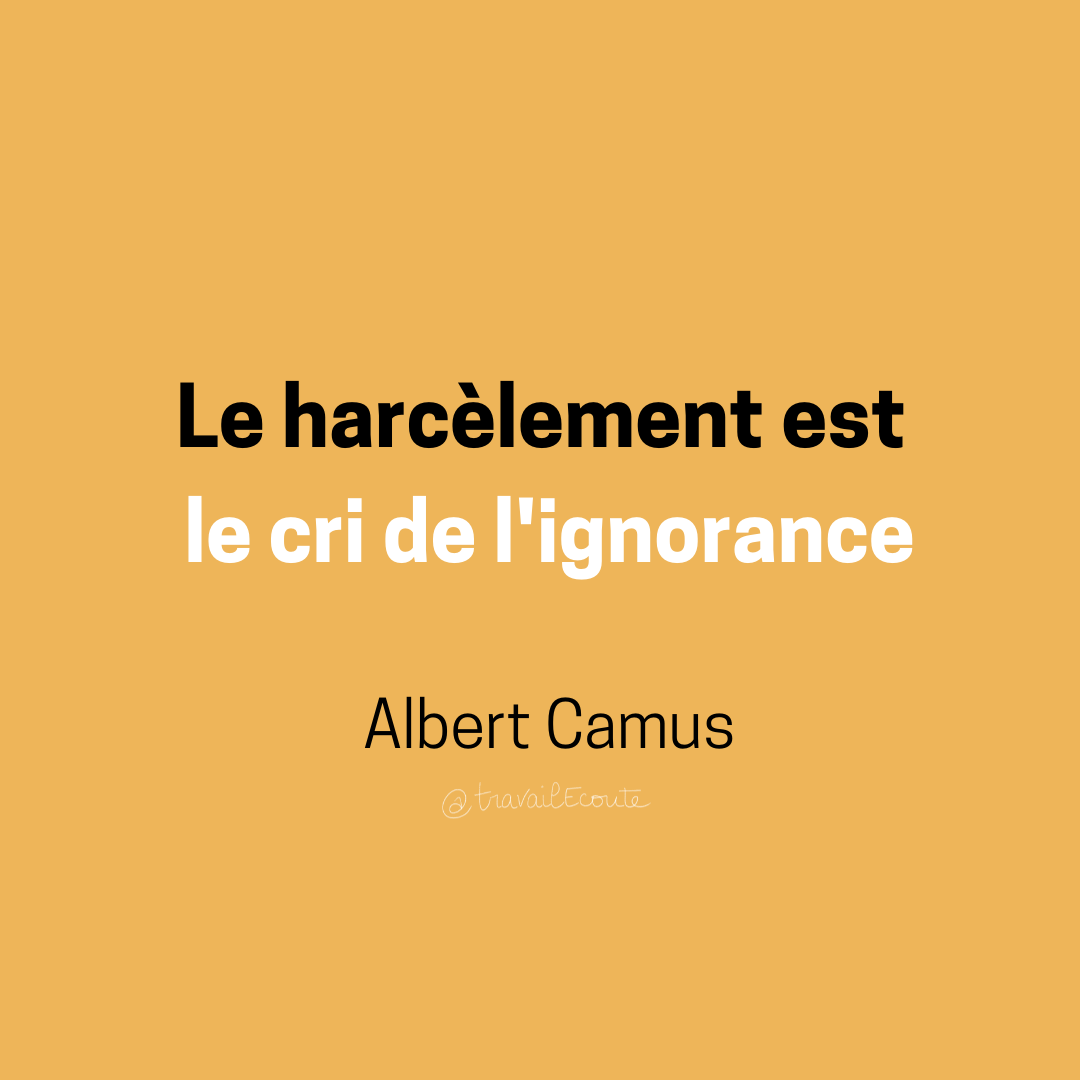 Pour rappel, le harcèlement repose sur des rapports de force et des stratégies d’intimidation de la part des harceleurs. Le harcèlement, ce n’est pas de l’humour, ce n’est pas non plus un conflit et si vous en doutez encore, rendez-vous sur l’article dédié : harcèlement moral. A ce propos, Marie-France Hirigoyen, psychiatre et psychanalyste, explique : « le harcèlement moral s’enracine dans des relations de pouvoir déséquilibrées où le harceleur cherche à dominer et contrôler, reproduisant souvent des comportements appris dès l’école ».