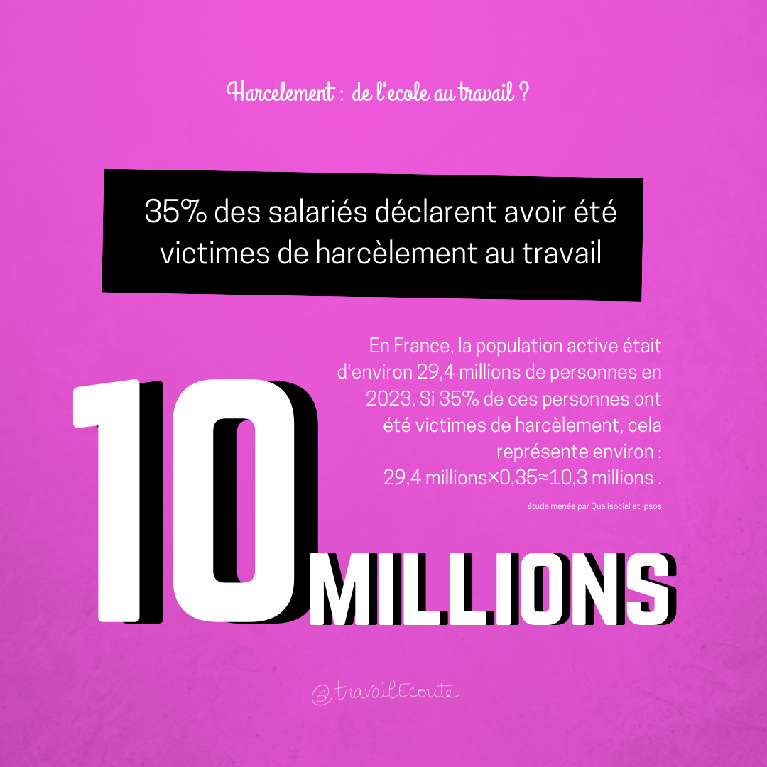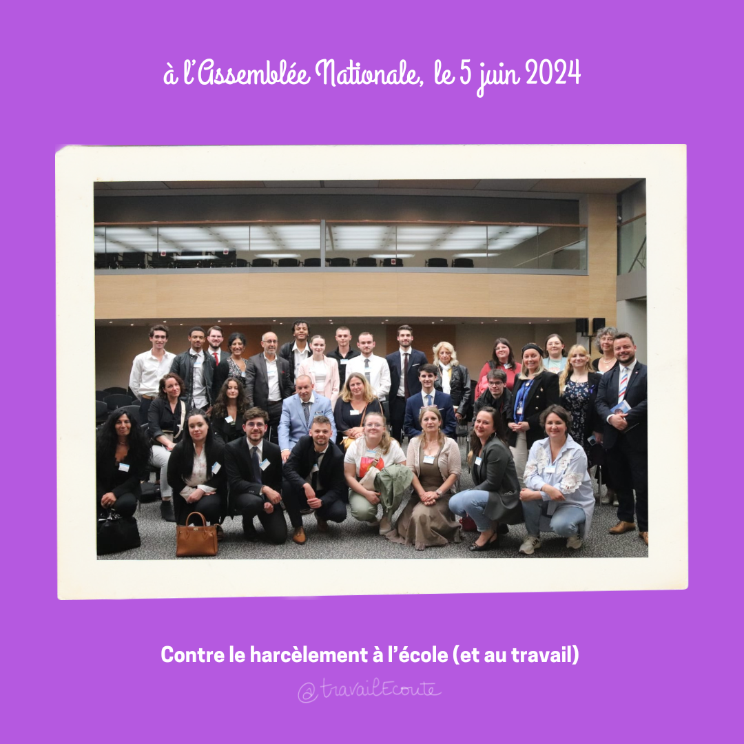 Invitée au 1er Colloque de la Fondation Jeunesse France Harcèlement, mercredi 5 Juin 2024 à l’Assemblée Nationale pour représenter TravailEcoute, j’ai soulevé la question de la corrélation entre le harcèlement à l’école et le harcèlement au travail (en passant par l’étudiant ou l’apprenti), suscitant une réflexion autour des possibles liens de causalité entre ces deux phénomènes.