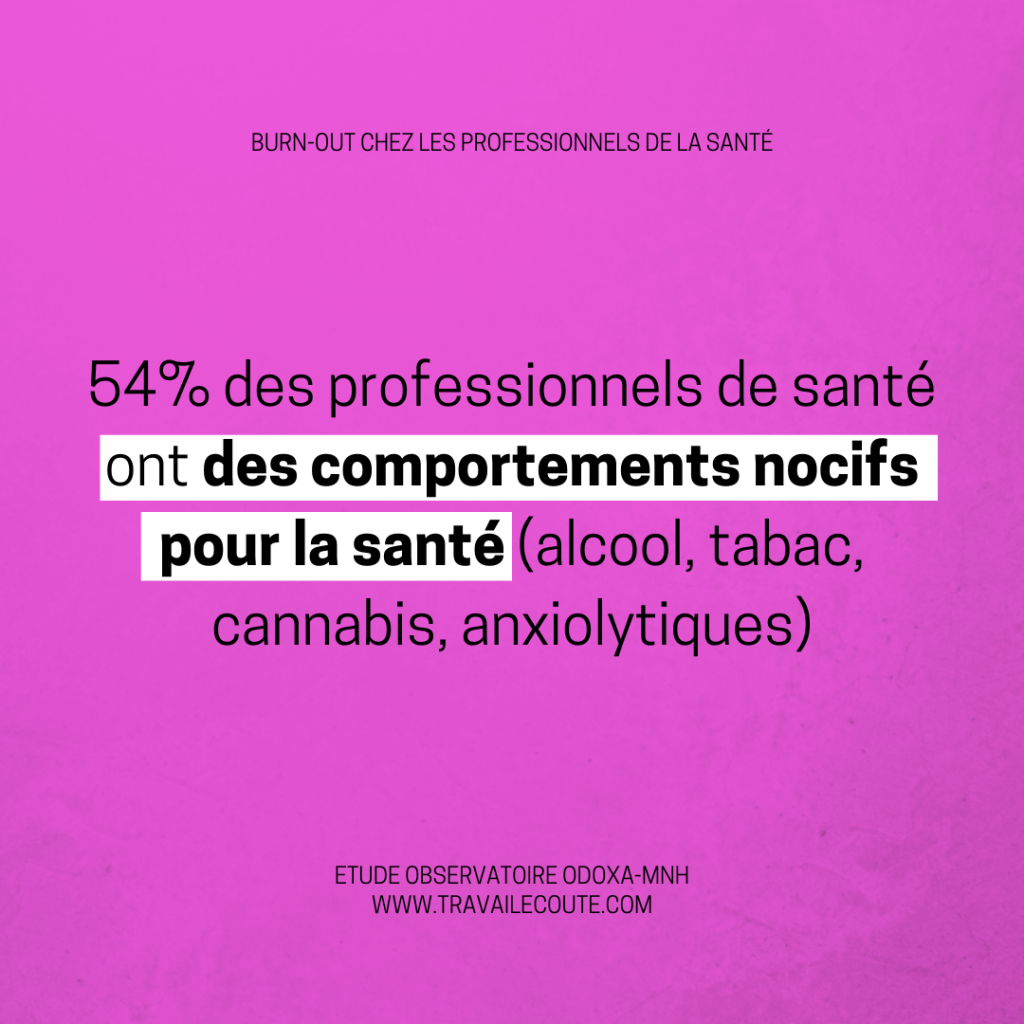 Le stress chronique et l’épuisement se traduisent également par des comportements nocifs pour la santé. En effet, 54 % des professionnels de santé adoptent des pratiques potentiellement dangereuses, telles que la consommation d’alcool, de tabac, de cannabis ou d’anxiolytiques. Ces comportements, bien que souvent adoptés comme mécanismes de gestion du stress, peuvent, à long terme, aggraver la santé mentale et physique des soignants et leur bien-être général.